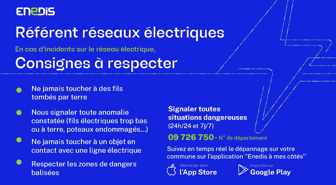 ⚠️Enedis vous rappelle les consignes de sécurité à respecter en cas d’incident sur le réseau électrique. Les câbles tombés à terre sont dangereux, ne jamais les toucher.